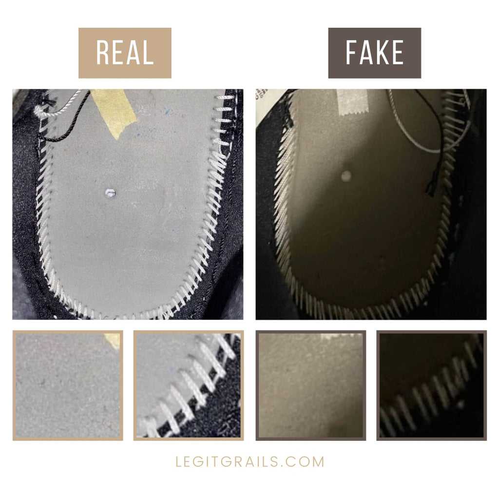 When examining the footbed, take out the insole to see underneath.One of the most noticeable differences between a fake and authentic Jordan University Blue is the stitching on the footbed. On the genuine footbed, the stitches are small and precise. They should be evenly spread around the edge of the footbed, with consistent size and thickness.However, the fake pair deviates from this pattern. You can clearly see that almost every stitch varies in position and size. The threads also differ in how closely they’re sewn, with short and thin stitches on the bottom right side and long and thick stitches on the upper left.Lastly, focus on the material of the footbed, which resembles cardboard. In this case, the real one seems to have a more «grainy» texture than the fake version.