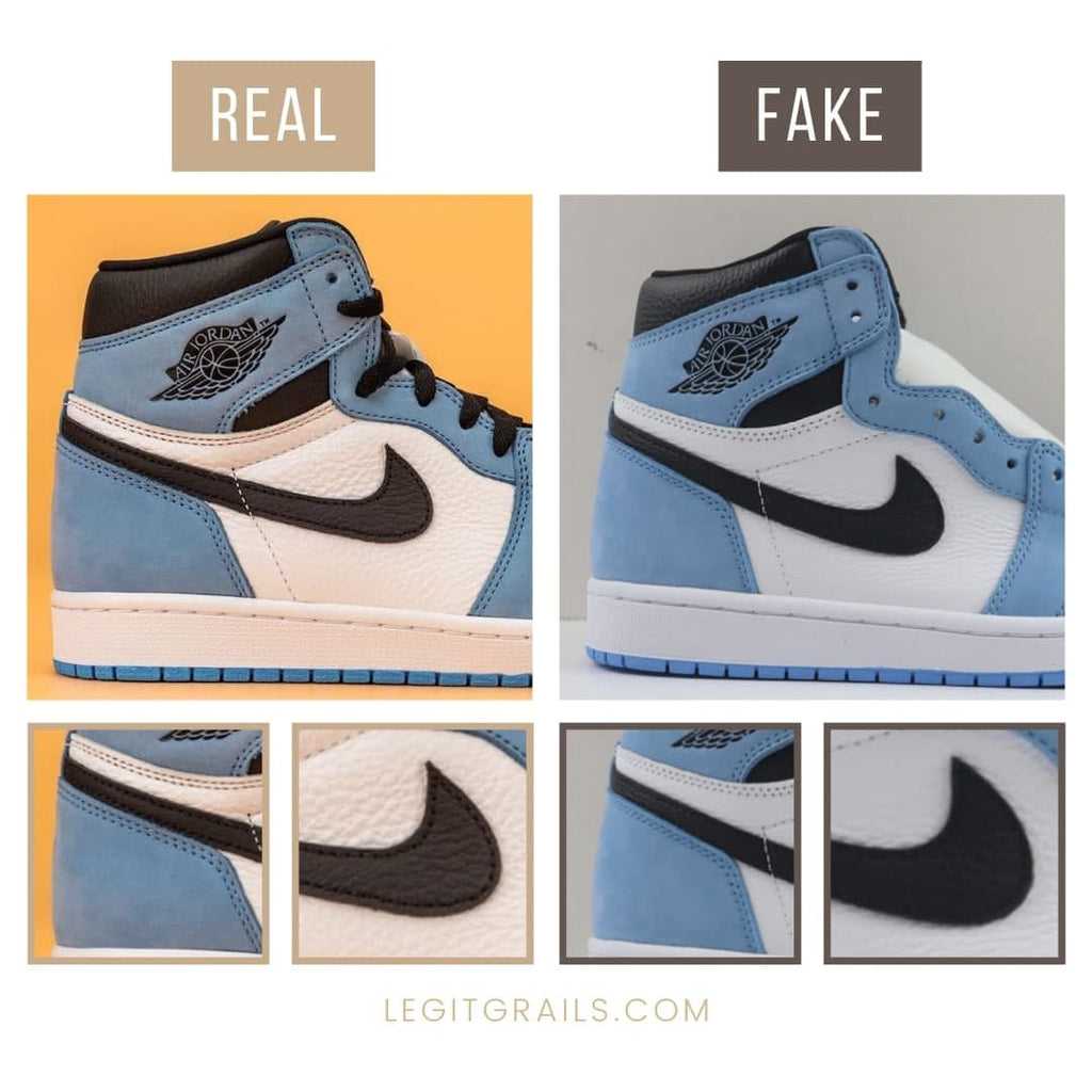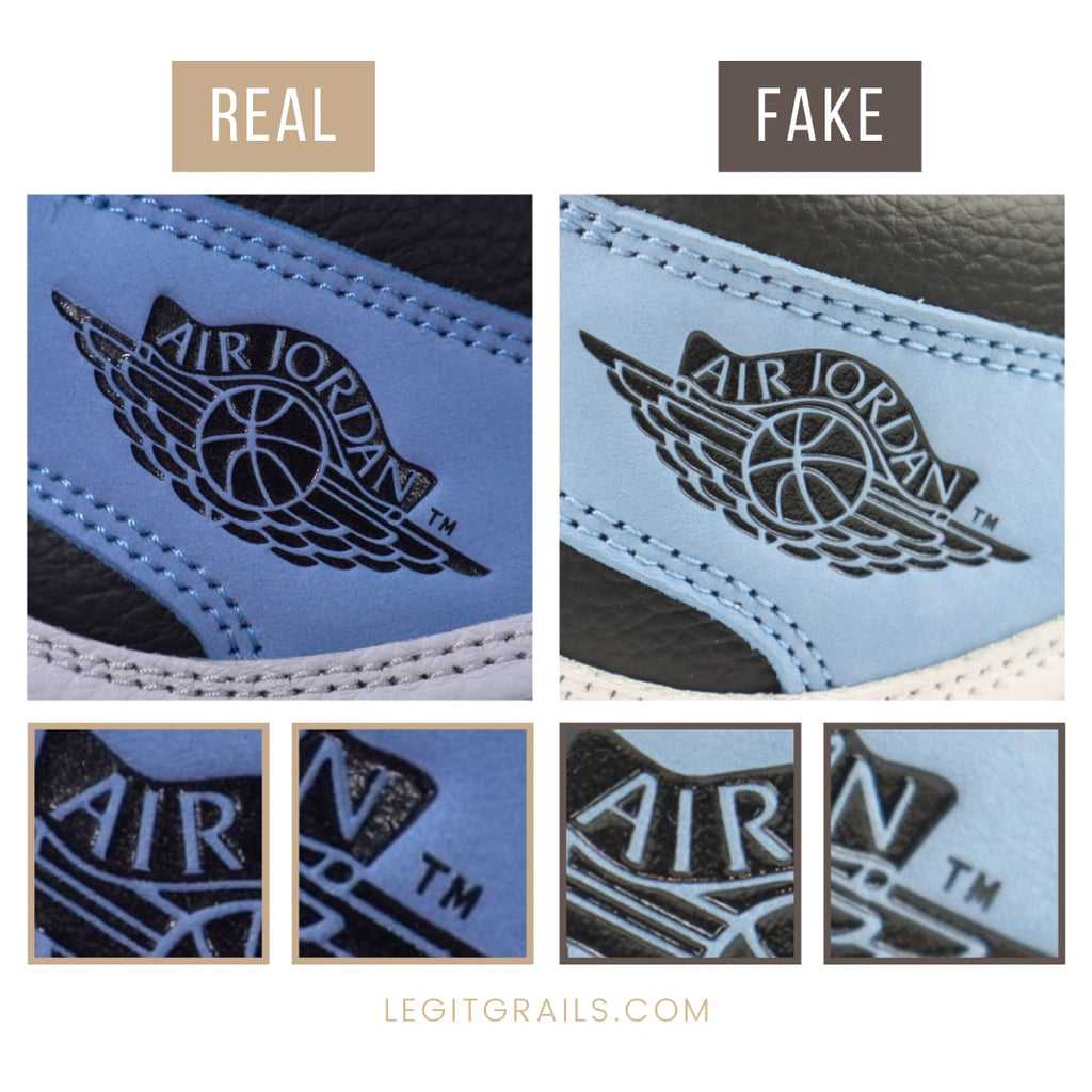 One notable flaw in replica Jordan 1 University Blue pairs relates to the spacing between the logo’s elements. The real logo displays narrower gaps (such as those between the wings), resulting in a sleeker look.Regarding the stitching, you can apply the same methods we’ve previously discussed for authentication. The key is ensuring that each stitch is consistently aligned.Lastly, it’s important to evaluate the fonts used in the logo. A helpful clue is the  sign. In genuine logos, the letters are wider with clearer lines.