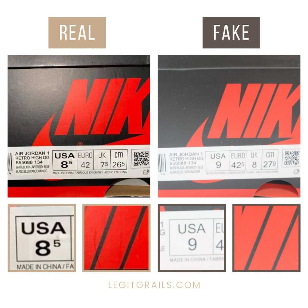 Let’s wrap up by discussing the shoebox.The initial difference between a fake and a genuine is the box’s shine. The real box reflects much light, while the replica has a duller finish and absorbs it. Furthermore, the colors on the real box appear more vivid, whereas those on the fake one look faded.Next, pay attention to the noticeable Nike logo. Specifically, look closely at the fine lines that separate the letters of the logo. These lines should be thicker on the genuine box compared to the replica. Additionally, the fake box shows a slight tilt in these lines.Lastly, take a look at the label that lists the various sizes. The font here is crucial. In the right photo, the letters are notably thinner, suggesting that the replica makers used the wrong font. Also, notice that the «made in China» text beneath the size table is written in much smaller letters.