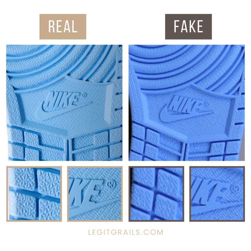 Let’s delve into this eye-catching pair’s distinctive feature: the vibrant blue outsole. The color truly enlivens the design, setting it apart and making color accuracy pivotal.Now, note the outsole’s centerpiece—a prominent Nike logo. Start by examining the logo’s placement for any irregularities. Firstly, it should be perfectly centered on the outsole. Secondly, unlike the imitation version, it shouldn’t be excessively tilted.Progressing, examine the font for any deviations. The  symbol must be clear, evident, and appropriately sized. Also, don’t overlook the Swoosh. In fake versions, it appears slightly shorter and less curved.The outsole showcases a pattern of small lines and other elements. While these might not catch the eye from a distance, their significance remains. Ensure these elements are crisp, well-defined, and don’t merge or appear blurry.