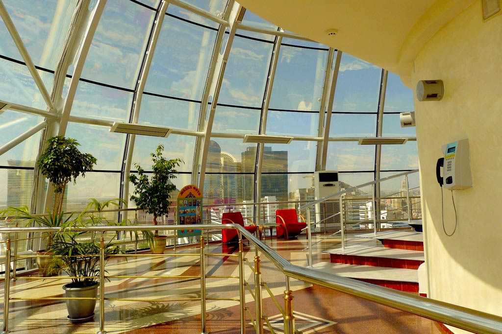Оттуда же можно подняться на лифте на самый верхний уровень — шар, внутри которого располагаются бар и панорамный зал. Обзорные экскурсии для посетителей проводятся на казахском, русском и других языках.
