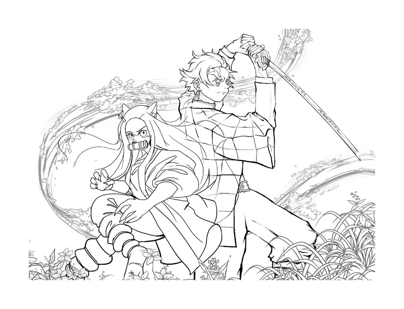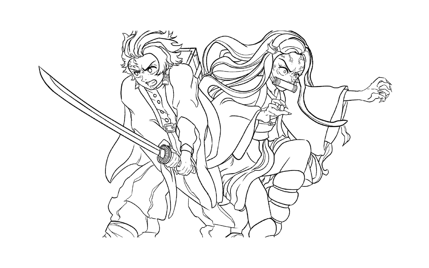 Незуко и Танджиро борются с демонамиСкачать раскраскуРаспечатать раскраску