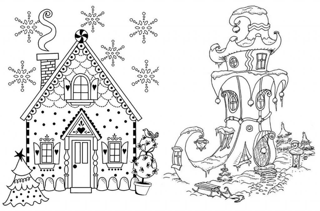 А здесь нужно постараться — пряничный домик и домик сапожок для эльфов раскрашивать сложно. Здесь много деталей, поэтому лучше сначала приступить к первой картинке с широкими контурами, а потом перейти к более сложной. Ребенок может придумать по мотивам картинки свою сказку о том, кто в них живет. Готовую картинку можно покрыть блестками, приклеить пайетки или наклеить вату, будто это снежок.