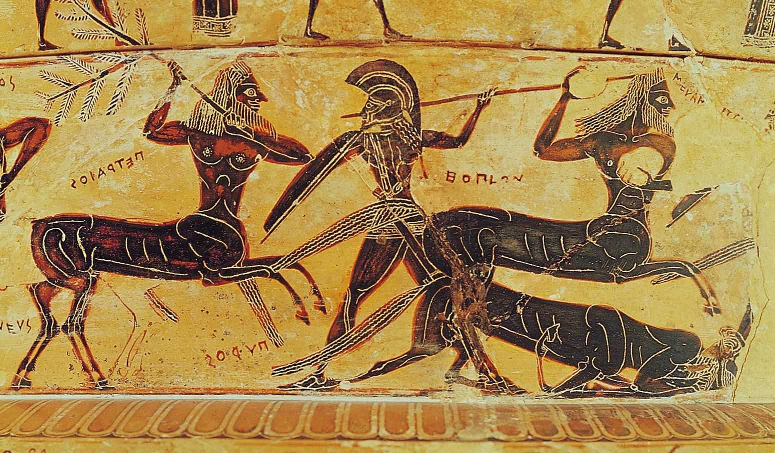 Популярным поэтическим сюжетом античности была кентавромахия, битва лапифов с кентаврами, разгоревшаяся из-за необузданного нрава последних на свадебном пиру царя лапифов Пирифоя.