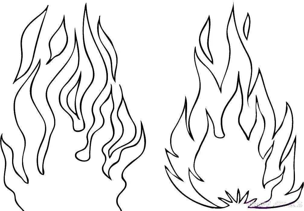 Огонь на рисунках имеет двойную окраску – жёлтые языки по центру обрамляются красными всполохами по контуру пламенных полос.