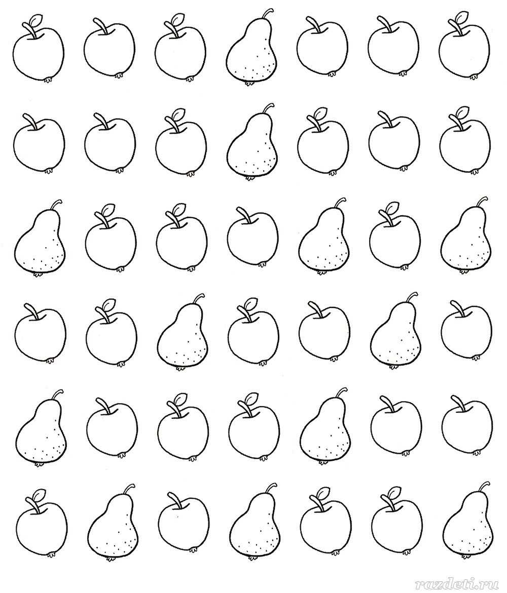 №5. Обведи яблоки с листиками красным карандашом, яблоки без листиков – жёлтым, а груши – зелёным. Постарайся выполнить задание как можно быстрее.