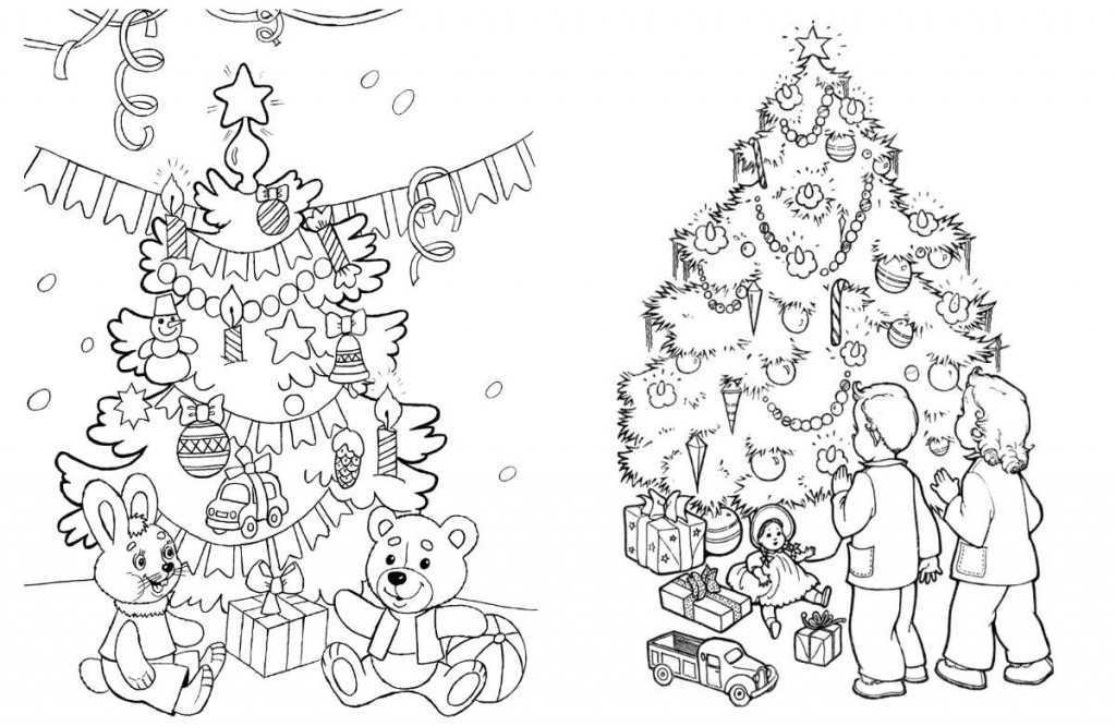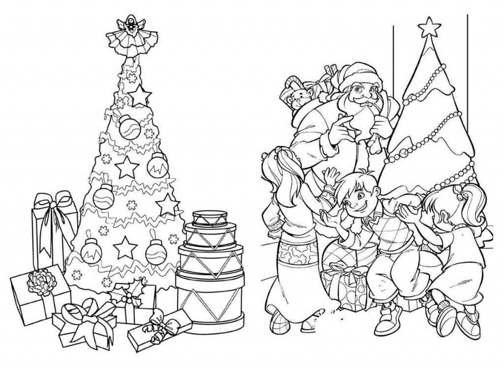 Под пушистой зеленой детей ждут подарки. Нужно только раскрасить картинку, чтобы она стала праздничной.