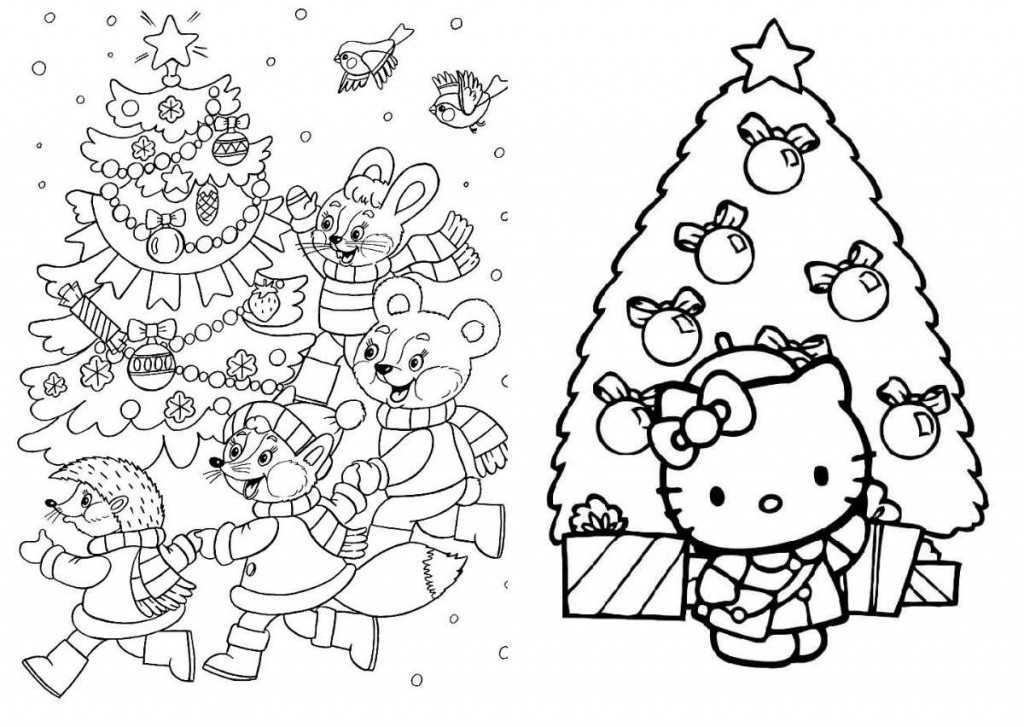 С елкой дружат животные в лесу, они тоже водят хороводы, как и ребята. На другой картинке мультперсонаж Китти.