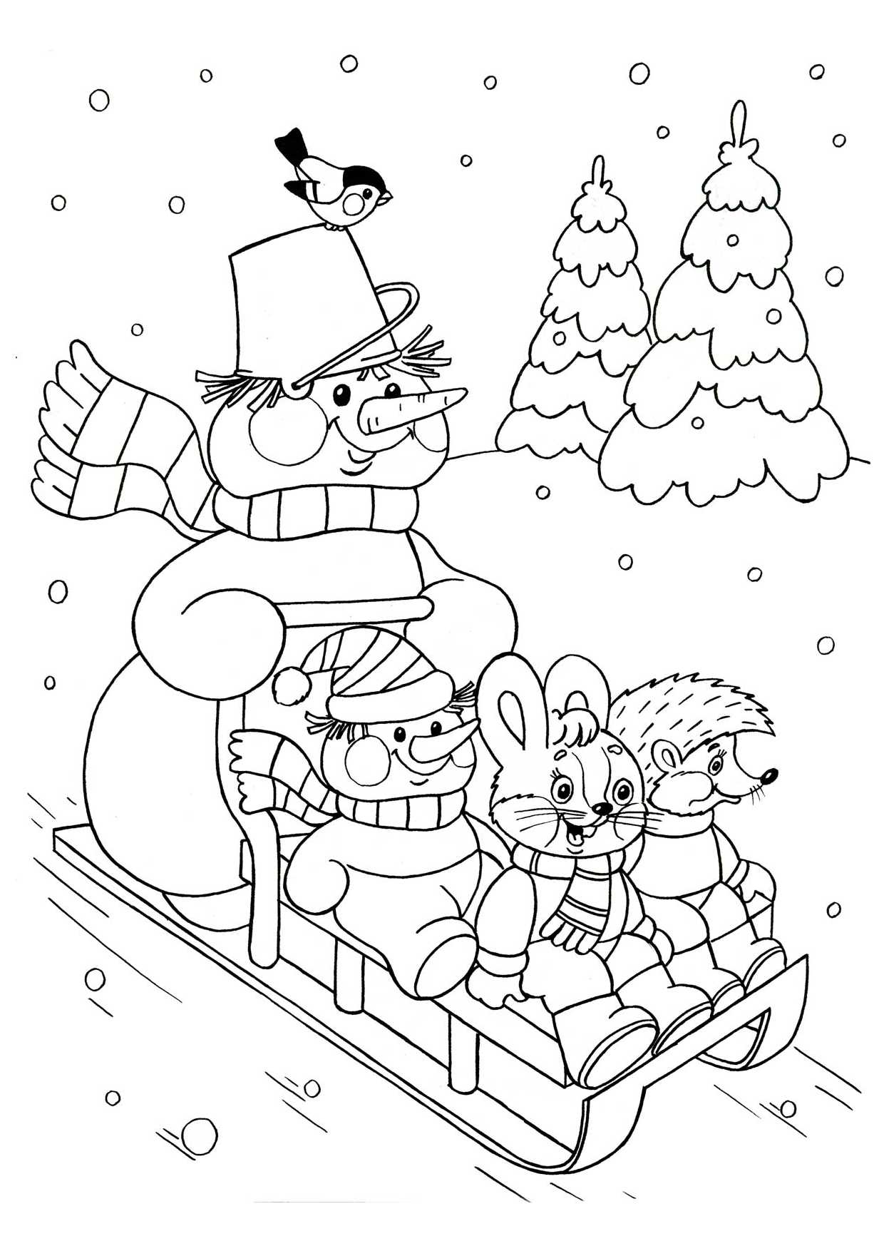 Все лесные малыши На раскраске хороши! В центре бравый снеговой Наш приветливый герой: