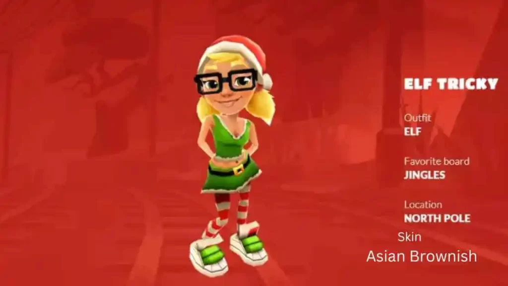 Elf Tricky is an elf-themed variant of Tricky, the core team member of the Subway Surfers. She sports a festive elf outfit, with a green, red, and white combination color palette.