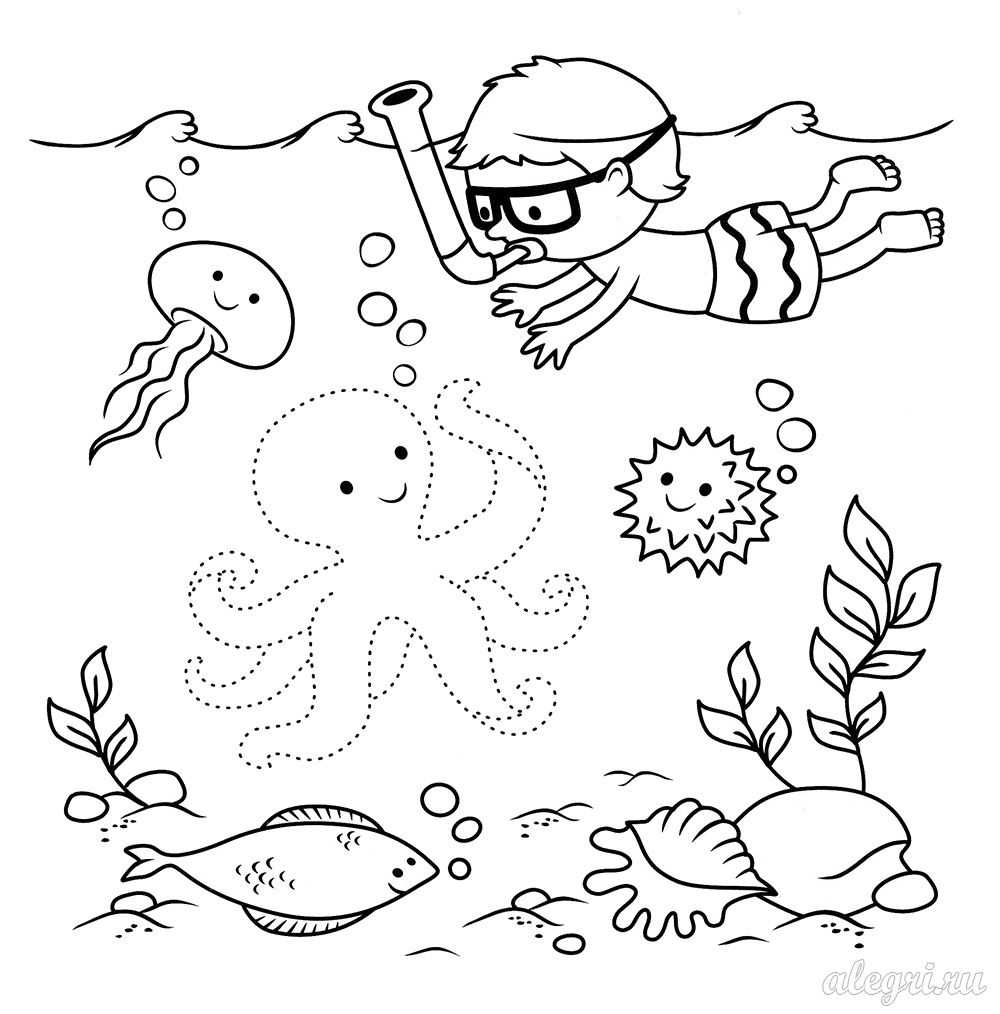 Обведи осьминога по точкам. Дорисуй ласты, чтобы мальчику было удобно плавать. Каких морских обитателей мальчик увидел под водой?
