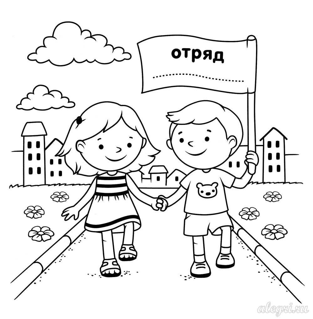 Придумай название отряду, в котором оказались девочка и мальчик, и напиши его на флажке.