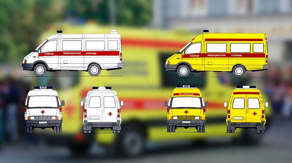 Белый фон для простых машин и жёлтый (лимонный) – для реанимационных автомобилей, красные полоски.