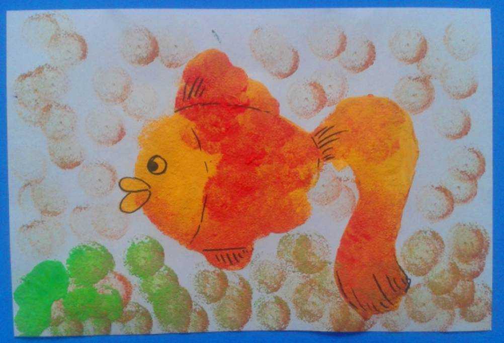4. Фон около рыбки так же нужно заштамповать краской, нарисовать камешки, водоросли, то, что окружает рыбку в водоеме.