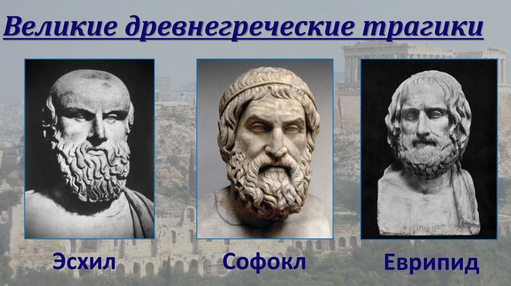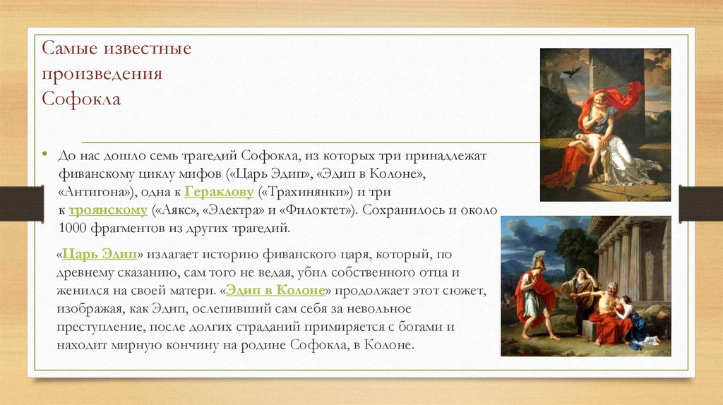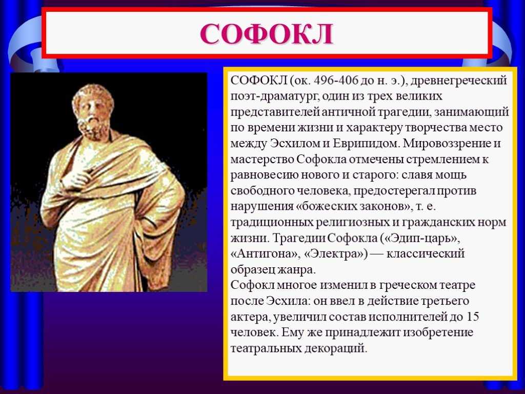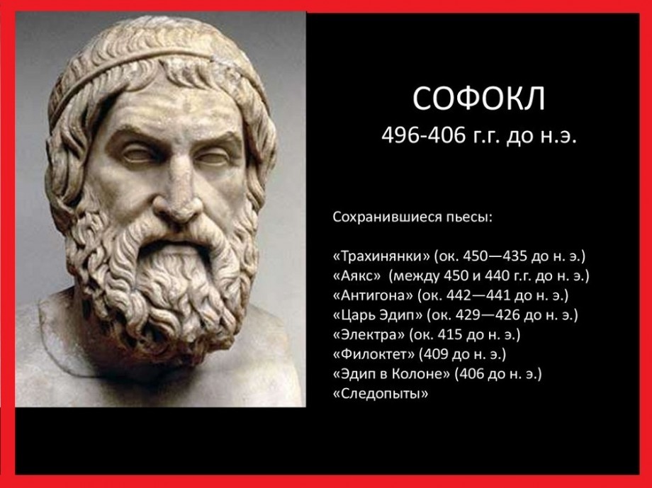 Софокл (ок. 496 до н. э. — ок. 406 до н. э.) считается одним из самых успешных трагиков своего времени. Он написал по меньшей мере 120 пьес, но, к сожалению, до наших дней дошло только семь. Из его сохранившихся пьес наиболее известной является Царь Эдип, часть тематической трилогии наряду с Антигона и Эдип в Колоне . Он одержал 20 побед в игровых соревнованиях; 18 из них были на Дионисии. Писал почти до самого дня своей смерти, свою последнюю пьесу Эдип в Колоне был подарен его сыном Иофоном в 401 году до нашей эры.