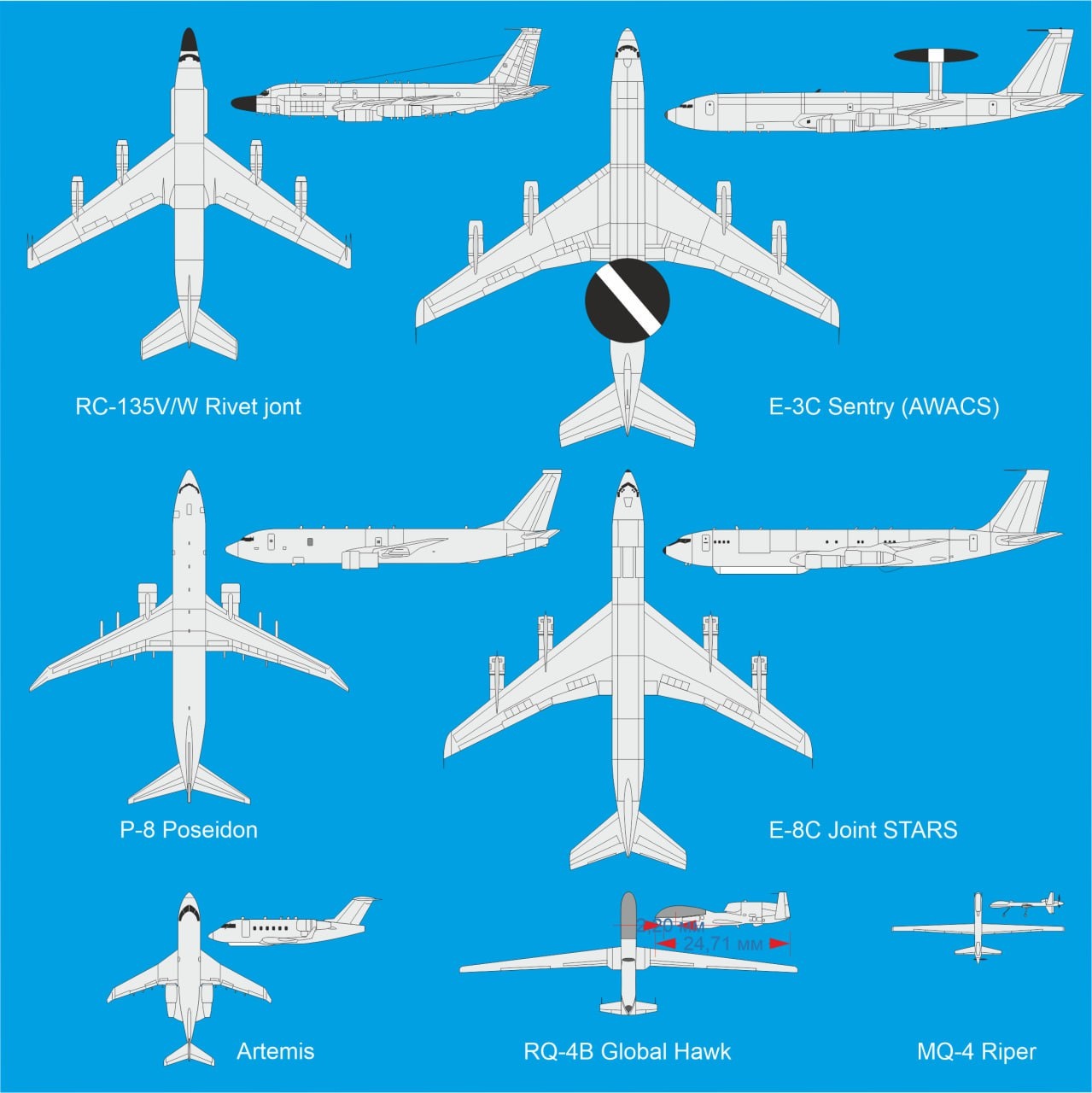 Однако размеры у БПЛА ограничены и они не могут нести на борту такое оборудование, как пилотируемые аппараты. Поэтому для сложных миссий в первую очередь привлекаются самолёты — RC-135V/W, P-8A Poseidon, E-3C Sentry AWACS и другие, для которых наземная разведка — не основная задача. Но именно они самые частые гости у наших границ.