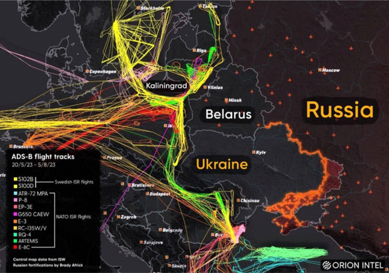 Накопительная схема полётов разведывательной авиации в регионе Украины и запада России.