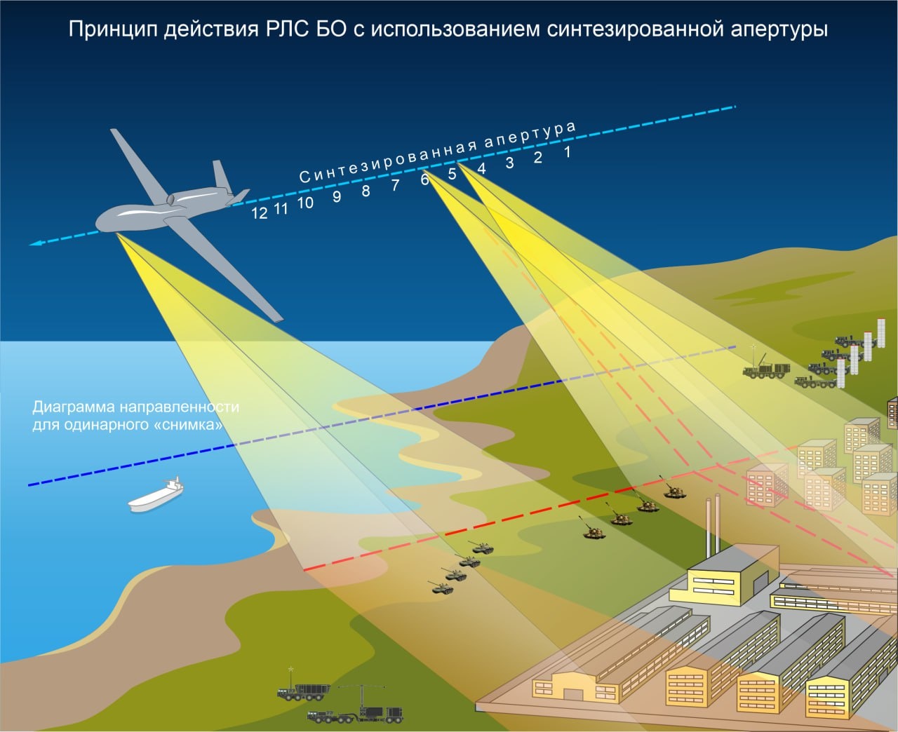 Принцип действия РЛС БО с использованием синтезированной апертуры.