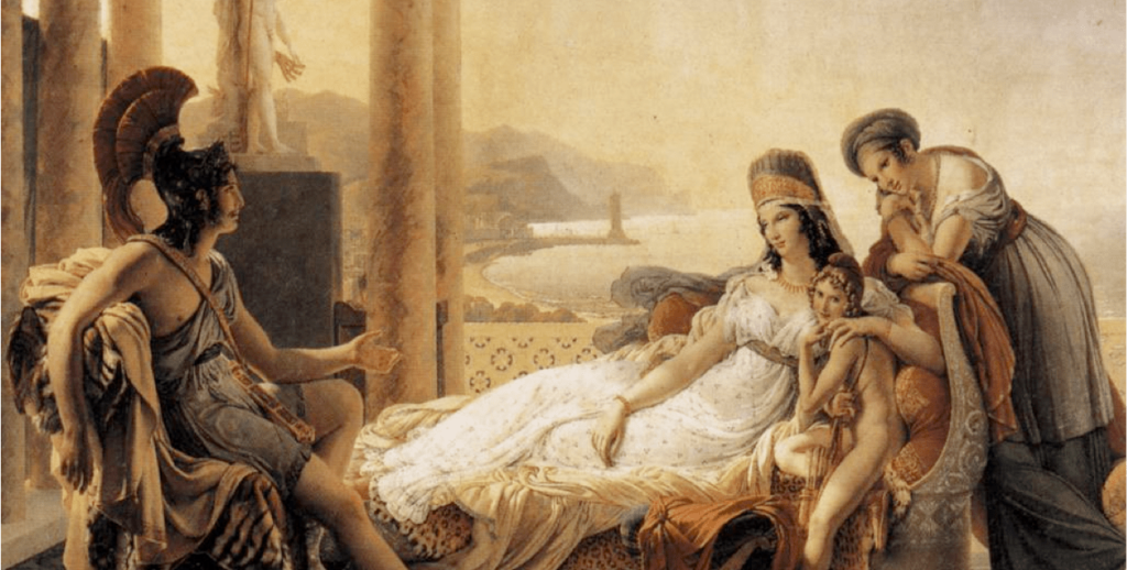 Эней рассказывает Дидоне о Троянской войне и о том, как ему удалось бежать со своим отцом и сыном по приказу богиня венера.