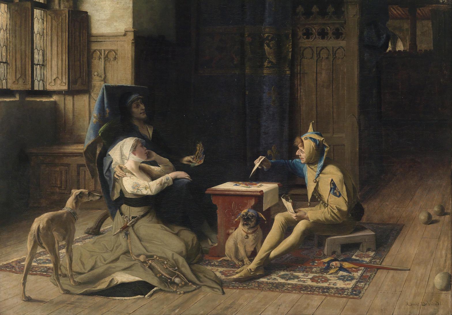 «Маленькая королева Одетта де Шамдивер утешает его, пока королева Изабелла танцует с Герцогом Орлеанским в том же дворце, где ее муж лежит, страдая».