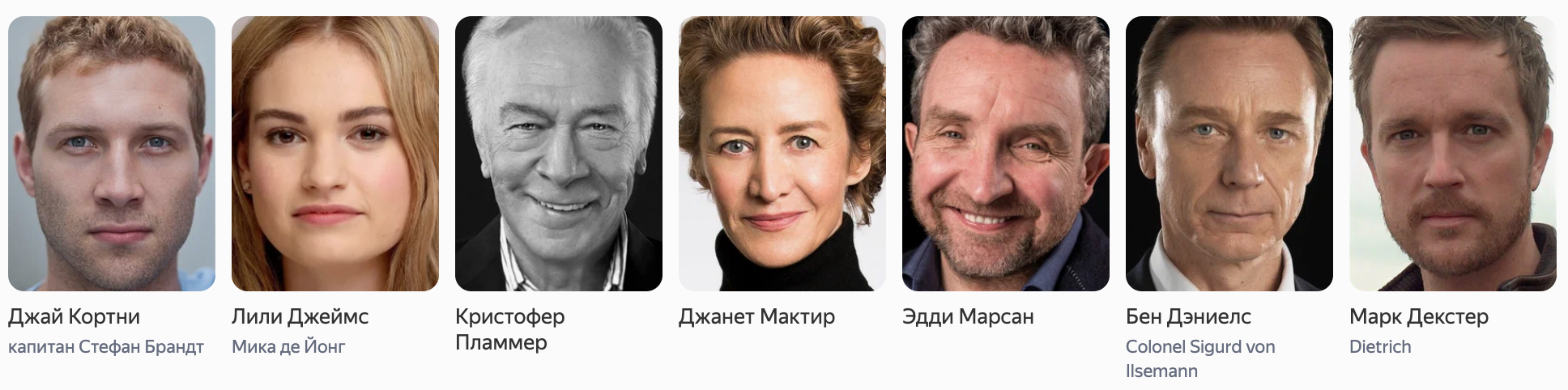 - Вильгельм II – Кристофер Пламмер («Игры разума», «Поющие в терновнике», «Нюрнберг», «Иисус из Назарета»);