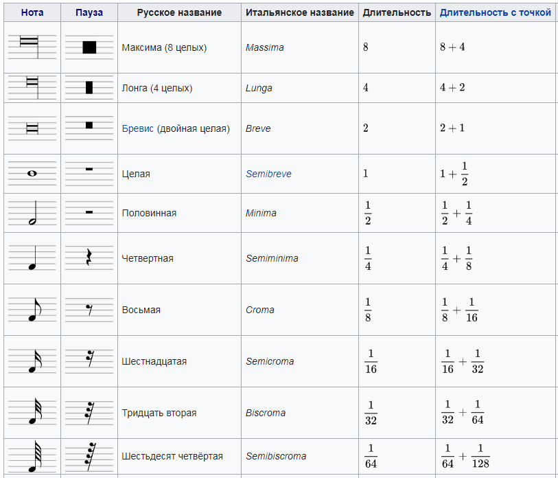 Паузы измеряются по такому же принципу, как нотные длительности. Пауза точно так может быть целой, половинной и т.д. Однако пауза может длиться дольше, чем целая нота, и для таких случаев придуманы особые названия. Так, если пауза длится в 2 раза дольше, чем целая нота, ее называют бревис, если в 4 раза дольше – это лонга, в 8 раз – максима. Полный перечень названий с обозначениями можно увидеть в нижеследующей таблице: