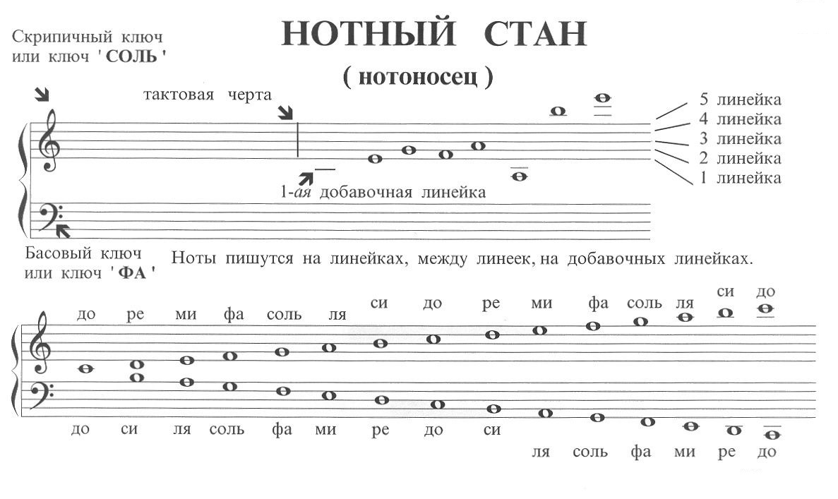 Заметим, что когда-то ключей «До» было больше. Ключ «До» на 1-й линии назывался сопрановым, на 2-й – меццо-сопрановым, на 5-й – баритоновым, а употреблялись они для вокальных партий соответственно указанным диапазонам. Вообще, разные ключи в нотах нужны, чтобы не делать добавочные линии нотоносца в избыточных количествах и облегчить восприятие нот. К слову, чтобы упростить чтение нот, используется ряд дополнительных обозначений, о которых мы сейчас поговорим.
