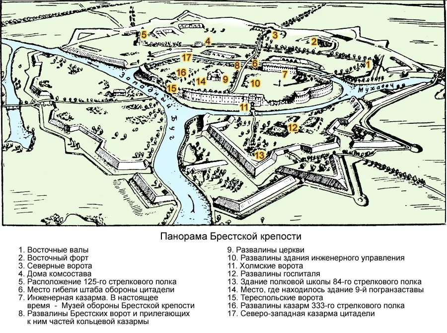 Талантливые военные инженеры создали здесь самую неприступную по тем временам систему укреплений. Крепость со всех сторон окружил десятиметровый земляной вал, внутри которого были устроены продовольственные склады, а у его подножия были прорыты широкие рвы, которые вместе с рукавами рек Буг и Мухавец разделили крепостную территорию на четыре острова-укрепления. Центральный остров стал цитаделью Брестской крепости и был обнесен двухэтажным толстостенным кирпичным зданием, выполнявшим одновременно роль крепостной стены и казарм. Под самой крепостью было вырыто множество подвалов и подземных ходов, которые соединяли между собой различные части крепостной территории.