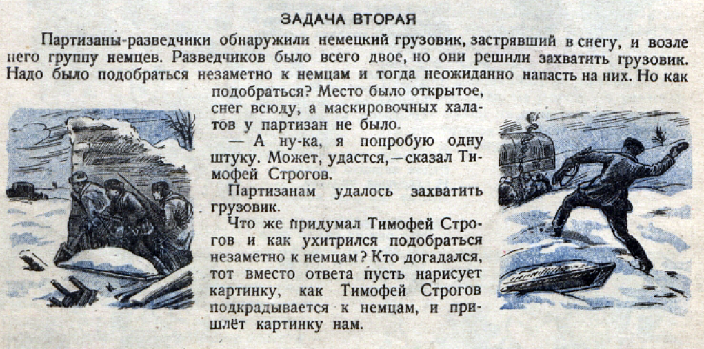 Партизаны-разведчики обнаружили немецкий грузовик, застрявший в снегу, и возле него группу немцев. Разведчиков было всего двое, но они решили захватить грузовик. Надо было подобраться незаметно к немцам и неожиданно напасть на них. Но как подобраться? Место было открытое, снег всюду, а маскировочных халатов у партизан не было. — А ну-ка, я попробую одну штуку. Может, удастся, — сказал Тимофей Строгов. Партизанам удалось захватить грузовик. Что же придумал Тимофей Строгов и как ухитрился подобраться незаметно к немцам?Партизан накрылся корытом, обсыпанным снегом, и ползком под ним подобрался к грузовику врага. Морская задача. А вот такие задачи приходится решать морякам на войне. К берегу подошёл осенью большой пароход. Подошёл, стал носом к набережной. А тут ударил лютый мороз. Корабль так и застыл во льду. Надо пароход разгружать. А грузовые люки у него на корме, далеко от берега. Ледоколов поблизости нет. Лёд взрывать порохом нельзя— немец услышит: дело около фронта. Людей тоже мало- всего человек пять или шесть; разгружать вручную —год провозишься. Словом, надо замёрзший корабль перевернуть кормой к берегу. Могут ли это сделать шесть человек, которые стоят на палубе? Спросили у капитана. Он сказал: «Я думаю— нет!» Спросили у механика. Механик говорит: «Конечно, нет!» Спросили у старого боцмана. «Безусловно — да!» ответил боцман. Не ответите ли вы, как это сделать?Боцман парохода был опытным моряком, поэтому предложил посыпать угольной крошкой лед вокруг парохода. Несмотря на заморозки, осенний лед совсем не толстый, поэтому на солнце он быстро растаял.