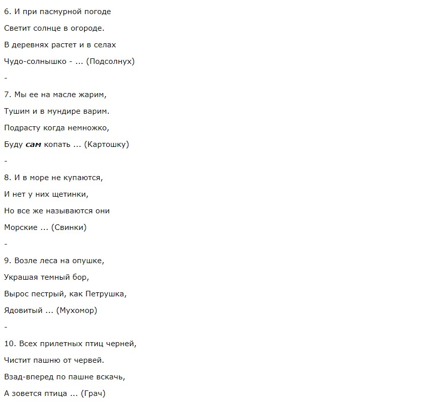 Ребята чуть постарше, в возрасте 5 и 6 лет, могут отгадать не только животных, но и праздники, виды спорта, предметы быта, деревья, грибы, ягоды, явления природы, овощи и фрукты. Однако для дошкольников также лучше использовать рифмованные задания, в которых просто нужно подставить правильный ответ.